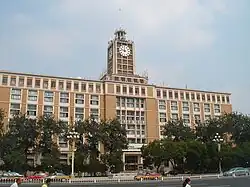 The city's first commercial railway, Tianjin-Lugouqiao Railway, was built from 1895 to 1897 with British financing.[130] It ran from the Marco Polo Bridge to Tianjin. The rail terminus was extended closer to the city to Fengtai and then to Majiapu, just outside Yongdingmen, a gate of the Outer City wall.[130] The Qing court resisted the extension of railways inside city walls.[130] Foreign powers who seized the city during the Boxer Rebellion extended the railway inside the outer city wall to Yongdingmen in 1900 and then further north to Zhengyangmen (Qianmen) just outside the Inner City wall in 1903.[130] They built an eastern spur to Tongzhou to carry grain shipped from the south on the Grand Canal. This extension breached the city wall at Dongbianmen.[130] The Lugouqiao-Hankou Railway, financed by French-Belgian capital and built from 1896 to 1905, was renamed Beijing-Hankou Railway after it was routed to Qianmen from the west.[131] This required the partial demotion of the Xuanwumen barbican. The completion of the Beijing–Fengtian Railway in 1907 required a similar break in Chongwenmen's fortification.[131] Thus, began the tearing down of city gates and walls to make way for rail transportation. The first railway in China built without foreign assistance was the Imperial Beijing-Zhangjiakou Railway. Built from 1905 to 1909, it was designed by Zhan Tianyou and terminated just outside Xizhimen.[131] By the late Qing dynasty, Beijing had rail connections to Hankou (Wuhan), Pukou (Nanjing), Fengtian (Shenyang) and Datong, and was a major railway hub in North China.