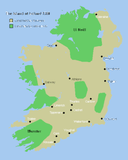 One of the most prosperous reigns of any High King was the reign of Toirdelbach Ua Conchobhair, who had overthrown Muircherteach and partitioned Munster in 1118. As King of Connacht and then King of Ireland, Ireland underwent a period of modernization and elevation on the European stage.[37] Under his rule, the first castles in Ireland were built bringing improved defence and brought a new aspect to Irish warfare. He also built a naval base and castle at Dún Gaillimhe. A settlement grew around this castle which would grow to be the city of Galway today.[38] He was a superb military commander and this allowed him to keep control of Ireland, with the help of the castles he built and his fleet based at Dún Gaillimhe.[38] He also had commercial and political links with the rulers of France, Spain and England, increasing Ireland's international presence which brought more trade to the island. His reign lasted more than 50 years.[38]