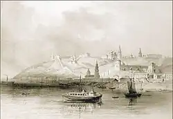 In September 1505, under the walls of the unfinished Kremlin, the attack of the Nogais and the Kazan Tatars under the leadership of the Kazan Khan Muhammad-Amin was repulsed.[16] The attacking army included 40,000 Kazans and 20,000 Nogais.[17] The leader of the Nogai, the brother-in-law of Mohammed-Amin, was killed by the cannonball that was released by Fedor Litvich. After that, there was a massacre between the Nogais and the Tatars and the khan was forced to relieve the siege.