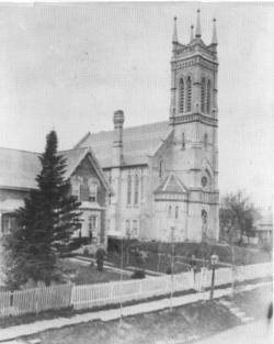 On 21 December 1879 the Methodist church had burnt down.[26] The congregation soon funded a new building which was opened in October 1881. The construction of this new church spurred the Presbyterians to also commission a new church to replace their old one that dated to 1821. Their new church opened May 24, 1881. The new churches had tall spires that dominated the skyline of Richmond Hill. The Anglicans responded in kind to this with the construction of their own spire to draw prestige to the church.[26] The official "Town Bell" was moved from the Robin Hood Hotel to the new Methodist church in 1883, a reflection of their changing importances in the town.[26] The parishioners at the more modest St. Mary Immaculate Roman Catholic Church built a new, larger building at Yonge Street and Dunlop Street in 1894. With this, the four large churches of Richmond Hill were the four largest buildings in Richmond Hill, defining its skyline.
