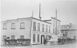 The 1880s and 1890s were economically bad for Richmond Hill. The Patterson brothers firm, a manufacturing of farming implements and a major employer in Richmond Hill moved their operation to Woodstock after the town council there offered a $35 000 bonus if they would, which allowed their growing operation to construct a much needed rail spur.[27] The Patterson brothers factory moved to Stratford in the winter of 1886/1887. The community experienced the economic decline that was occurring all across Ontario at the time, although perhaps not as strongly. The Trench Carriage Works and Newton Tanning Company remained major employers. The population declined, from 850 in 1890 to 650 in 1900. But many of the main stores along Yonge Street stayed open.[27]
