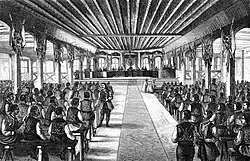 Turnovgrad was an administrative, military, economic, cultural and religious center.[5] During this period, the Art School of Tarnovo, the Tarnovo Literary School, the Turnovo Architecture developed. The city is ruled by several dynasties: Asenevtsi, Smilets, Terterovtsi, Shishmanovtsi. The city maintained commercial relations with major European cities and towns in the Middle East. Serbian King Saint Sava died in the city, his relics were later handed over to Serbia.[6]