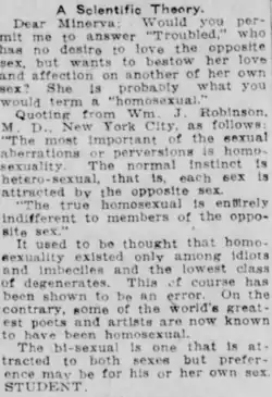 Most literature of the 1930s, '40s, and early '50s presented lesbian life as tragedy, ending with either the suicide of the lesbian character or her conversion to heterosexuality.[48] This was required so that the authorities did not declare the literature obscene.[49] For example, The Stone Wall, a lesbian autobiography with an unhappy ending, was published in 1930 under the pseudonym Mary Casal.[48] It was one of the first lesbian autobiographies. Yet as early as 1939, Frances V. Rummell, an educator and a teacher of French at Stephens College, published the first explicitly lesbian autobiography in which two women end up happily together, titled Diana: A Strange Autobiography.[50] This autobiography was published with a note saying, "The publishers wish it expressly understood that this is a true story, the first of its kind ever offered to the general reading public" [50] The first American magazine written for lesbians, Vice Versa: America's Gayest Magazine, was published from 1947–1948. It was written by a lesbian secretary named Edith Eyde, writing under the pen name Lisa Ben, an anagram for lesbian.[51] She produced only nine issues of Vice Versa, typing two originals of each with carbons.[52] She learned that she could not mail them due to possible obscenity charges, and even had difficulty distributing them by hand in lesbian bars such as the If Club.[52]