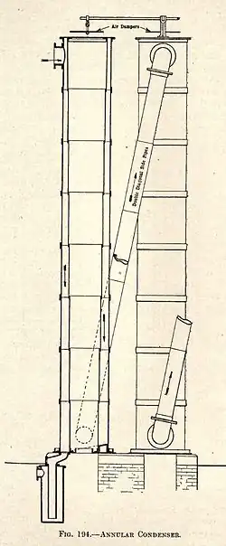 The annular atmospheric condenser was easier to control with respect to cooling rates. The gas in the tall vertical cylinders was annular in form and allowed an inside and outside surface to be exposed to cooling air. The diagonal side pipes conveyed the warm gas to the upper ends of each annular cylinder. Butterfly valves or dampers were fitted to the top of each vertical air pipe, so that the amount of cooling could be regulated.
