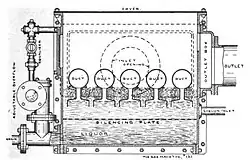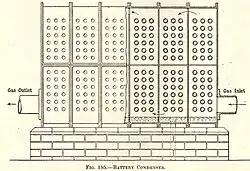 The battery condenser was a long and narrow box divided internally by baffle-plates which cause the gas to take a circuitous course. The width of the box was usually about 2 feet, and small tubes passed from side to side form the chief cooling surface. The ends of these tubes were left open to allow air to pass through. The obstruction caused by the tubes played a role in breaking up and throwing down the tars suspended in the gas.