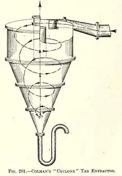 As extremely finely divided particles were also suspended in the gas, it was impossible to separate the particulate matter solely by a reduction of vapor pressure. The gas underwent processes to remove all traces of solid or liquid matter before it reached the wet purification plant. Centrifugal separators, such as the Colman Cyclone apparatus were utilized for this process in some plants.