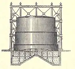 Gasholders were constructed of a variety of materials, brick, stone, concrete, steel, or wrought iron. The holder or floating vessel is the storage reservoir for the gas, and it serves the purpose of equalizing the distribution of the gas under pressure, and ensures a continuity of supply, while gas remains in the holder. They are cylindrical like an inverted beaker and work up and down in the tank. In order to maintain a true vertical position, the vessel has rollers which work on guide-rails attached to the tank sides and to the columns surrounding the holder.
