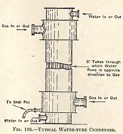 Unless the cooling water was exceptionally clean, the water-tube condenser was preferred. The major difference between the multitubular and water-tube condenser was that in the former the water passed outside and around the tubes which carry the hot gas, and in the latter type, the opposite was the case. Thus when only muddy water pumped from rivers or canals was available; the water-tube condenser was used. When the incoming gas was particularly dirty and contained an undesirable quantity of heavy tar, the outer chamber was liable to obstruction from this cause.