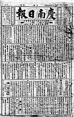 Gyeongnam Ilbo was the first ever, and only regional Korean-language newspaper founded during this period.[39] It was also the first newspaper in Jinju. It was founded on October 15, 1909.[56][57][55] Its company was also the first publicly-owned Korean press company.[56] The newspaper's founding was hailed by other Korean and even Japanese and Chinese newspapers.[57][56] It published critically about Japan until the beginning of the colonial period. It was then censored and suppressed, with increasing financial and political pressure applied to its staff.[56][57][55] It eventually halted publication in January 1915, although the newspaper eventually restarted twice after the liberation of Korea, and still persists to this day.[55][56][57]