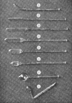 As with radium emanation, solutions of free radium salts were also placed in tubes; in this case, the tubes were made from platinum. In metal tubes, the radium could be employed in a number of ways: externally; to the interior of the body in places like the mouth, nose, esophagus, rectum and vagina; and into the substance of a tumor through incisions.[29]