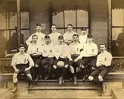Robert Barker (Hertfordshire Rangers), goal; Harwood Greenhalgh (Notts Club), three-quarter back; R. C. Welch (Harrow Chequers), half-back; F. Chappell (Oxford University), fly-kick; capt. Cuthbert Ottaway (Oxford University), middle; Charles Chenery (Crystal Palace), middle; Charles Clegg (Sheffield), middle; Arnold Kirke-Smith (Oxford University), middle; J. Brockbank (Oxford University) right side; W. J. Maynard (1st Surrey Rifles) left side; J. F. Morris (Barnes Club) left side.