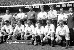 Forward Bobby Charlton, who was injured in the crash, recovered sufficiently to make his England debut in April that year and begin one of the great England international careers, which eventually yielded 106 caps, 49 goals and a World Cup winner's medal.[17] For the World Cup finals in Sweden, England exited in the group stages after a play-off defeat against the Soviet Union, after the two had finished level in second spot in their group.[18] England's inside forward Johnny Haynes remarked after elimination in 1958, "Everyone in England thinks we have a God given right to win the World Cup." Joe Mears as chief selector became the scapegoat.[14] However, by the end of the decade, emerging talents such as the prolific goalscorer Jimmy Greaves suggested that sufficiently talented players were available, provided the tactical side of the game could bring the best out of them.