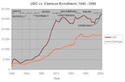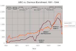 After World War II, enrollment at the university swelled from the influx of veterans. They were wholeheartedly welcomed by President Smith who actively campaigned for their attendance and he announced that every qualified veteran would be admitted to the university. The vast majority of South Carolina veterans chose to attend the university because of its hospitable atmosphere, but also for other reasons. They did not want to attend Clemson or The Citadel because "the prospect of returning home to attend a military college was distasteful for the older men leaving the military after fighting the largest war in world history."[18] In addition, Clemson's rural location and its self-imposed restriction on the number of students made it inaccessible for a large number of veterans. The university offered several special programs to meet the needs of the veterans and it continued an accelerated calendar until 1949. It was at this point in history that the two universities switched reputations and missions. Carolina became known as the university for the common man and an institution accessible for all whereas Clemson settled into a status of elitism.[18]