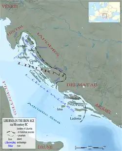 They are classified in some sources as a Venetic tribe, with some ties with the Illyrians,[5] or a purely Illyrian tribe.[1][6][7][2] The Histri are also described as Thracians;[8][2] an orientation includes them in the Liburnian linguistic area.[9]