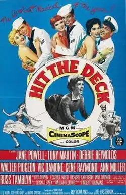 Hit the Deck is a 1955 American musical film directed by Roy Rowland and starring Jane Powell, Tony Martin, Debbie Reynolds, Walter Pidgeon, Vic Damone, Gene Raymond, Ann Miller, and Russ Tamblyn.[2] It is based on the 1927 stage musical of the same name – which was itself based on the hit 1922 play Shore Leave by Hubert Osborne – and was shot in CinemaScope. Although the film featured some songs from the stage musical, the plot was different.[3] Standards featured in the film include "Sometimes I'm Happy", "I Know that You Know", and "Hallelujah".[4][5]