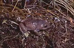 It is a small frog that has an olive-brown skin color with irregular dark patches around its body. The belly of the frog is a cream color, and the tips of the frog's hands are a bright yellow. It has a large, wide head with an oval body and a rounded snout. It has short limbs, and has large eyes that face forward. The Highland frog's eyes have diamond-shaped pupils. The female frogs are slightly larger than the male frogs. The length of their snouts have been recorded up to 3.7 centimeters.[4]