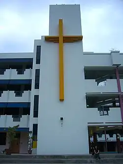 Expansion and refurbishment works commenced in May 1992.[2] The school's lower secondary classes shared premises with Hai Sing High School (present Hai Sing Catholic School) while the upper secondary classes reminded at the present site.[2] The official commissioning of the upgraded facilities was officially commissioned on 30 July 1994 by Gregory Yong, Archbishop of Singapore, The completed project added three new teaching blocks and an administrative block to the original building. The total built-in area was 9000 sq m.[2]