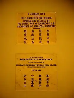 Secondary classes were started in 1958 and the school was renamed Holy Innocents' High School.[2] The new campus was declared open on 5 January 1958, with blessing by Archbishop Michel Olçomendy. Between 1960 and 1964, eight additional classrooms and two laboratories were built. Pre-University classes were introduced in 1965, and the school was further expanded in 1968 with an addition of three-storey building.[2] On 9 September 1983, Mr Ho Kah Leong, Parliamentary Secretary, Ministry of Education, officiated the opening of the Auditorium and four classrooms.[2]