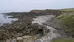 Continuing south along the waggonway, it made a level crossing with the road from the village at Chare Ends, immediately east of where it crossed the High Water Mark and became the traditional causeway to the mainland at Beal.[12] That traditional causeway is nowadays commonly referred to as the "Pilgrim's Path".[13] In 1954 a second, much shorter metalled causeway was opened between Beal and the Snook. This, in turn, was joined to Chare Ends by a metalled road in 1966.[14] By 2015 the waggonway trackbed northwards from the site of the level crossing was a public footpath.[15]