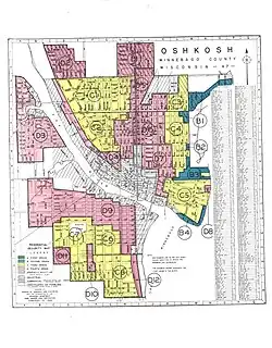 HOLC is often cited as the originator of mortgage redlining.[11][12]HOLC maps[13] generated during the 1930s to assess credit-worthiness were color-coded by mortgage security risk, with majority African-American areas disproportionately likely to be marked in red indicating designation as "hazardous."[14] These maps were made as part of HOLC's City Survey project that ran from late 1935 until 1940.[15] Perhaps ironically, HOLC had issued refinancing loans to African American homeowners in its initial "rescue" phase before it started making its redlining maps.[16] The racist attitudes and language found in HOLC appraisal sheets and Residential Security Maps created by the HOLC gave federal support to real-estate practices that helped segregate American housing throughout the 20th century.[17]