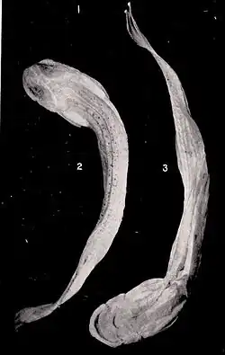 Homodiaetus is currently distinguished from other genera of Stegophilinae by the combination of the origin of the pelvic fin midlength between the tip of the snout and the caudal-fin origin, the opercle with three or more odontodes, and the gill membranes confluent with the isthmus.[2] Homodiaetus species are small and grow up to 42 millimetres (1.7 in) SL. They are transparent with the except of the head and abdomen.[2] Homodiaetus species have a thin body and depressed head that is almost as wide as the head is long. The dorsal and ventral profiles are straight except for a convex head. The mouth is inferior.[2]