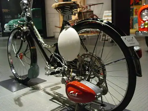 The Honda Cub F is a motorized bicycle, sometimes also categorized as a moped, introduced by Honda in 1952. It was a "clip-on" gasoline engine kit for bicycles produced by other manufacturers, identified by the slogan the white tank and the red engine (白いタンクに赤いエンジン) and popular for a design that prevented the two-stroke engine exhaust and oil from hitting the rider. The Society of Automotive Engineers of Japan (in Japanese), includes the 1952 Honda Cub F as one of their 240 Landmarks of Japanese Automotive Technology.[1]