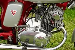 The SS125A had 17 inch wheels; the front rim was either 1.4 inches or 1.6 inches wide while the rear rim was 1.6 inches wide.[2] The 124 cc twin cylinder engine was basically same as the earlier CA95/CB92 layout, using the left side of the engine for the timing chain to the camshaft.[1] It used a Keihin Seiki vacuum carburetor, as opposed to the earlier engines, which were equipped with a slide valve type. The home market (Japan) version was built using a 180 degree crankshaft, as opposed to the 360 degree layout in the U.S.models.[3]