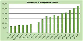 By the turn of the 21st century, passenger numbers at Honeybourne were slowly increasing: from an estimated 13,360 in 1997–98 to an estimated 22,077 in 2004–05. Since then the number of passengers using the station has increased rapidly, and the estimated total for 2018–19 was more than 66,000.[47] Estimated passenger totals have risen by 78% in 10 years and trebled in 14 years.