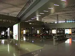 Former Terminal 2 with an area measuring 140,000 m2 (1,500,000 sq ft), together with the SkyPlaza, opened on 28 February 2007 along with the opening of the Airport station's Platform 3.[49] It was only a low-cost carrier check-in and processing facility for departing passengers with no gates or arrival facilities (passengers were transported underground to gates at Terminal 1). The SkyPlaza was situated within. Former Terminal 2 was shut down on 28 November 2019 at 23:00 to make way for a new satellite terminal from the three-runway system.[50]