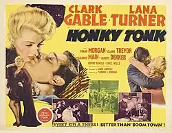 Honky Tonk is a 1941 American historical western comedy drama film directed by Jack Conway and starring Clark Gable and Lana Turner. The supporting cast features Claire Trevor, Frank Morgan, Marjorie Main, Albert Dekker and Chill Wills. Produced by Pandro S. Berman, the film was made and distributed by Metro-Goldwyn-Mayer.