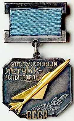The honorary title "Honoured Test Pilot of the USSR" was awarded to military and civilian test-pilots 1st class of the aerospace and defense industry and the Soviet Armed Forces, for multiple years of creative work in the field of testing and research of new aviation technologies.[1]