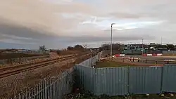 The first stage of construction work for this project, involving the creation of the station car park and adjacent bus stop, commenced on 28 May 2019.[18] It was later followed by the construction of the station itself, as well as associated signalling and track realignment works, in the second stage.[18][19] In late April 2020, having completed both platforms, the station's footbridge and associated ramps and stairs were installed by Story Contracting, using a 500 tonne crane. Following this, work progressed through mechanical, electrical and telecoms works and, finally, interface works between the station and car park.[20]