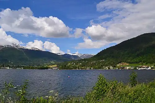 The village of Grodås lies at the eastern end of the lake in Volda Municipality in Møre og Romsdal county and the village of Mogrenda is located on the western end of the lake in Stad Municipality in Vestland county. The European route E39 highway runs near the lake. The village of Heggjabygda and Heggjabygda Church lie on the northern shore of the lake.
