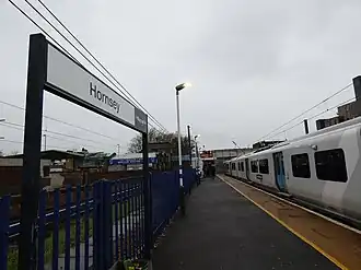 Hornsey railway station is in Hornsey in the London Borough of Haringey, north London. It is on the Great Northern route that forms part of the East Coast Main Line, 4 miles 4 chains (6.5 km) down the line from London King's Cross, and is situated between Harringay to the south and Alexandra Palace to the north.[2]