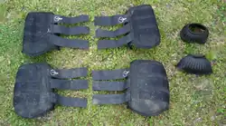 Brushing boots, also called splint boots, galloping boots and sport boots, are used to protect a horse's legs during exercise from injuries caused by strikes from the opposite leg, hoof or horseshoe. The boots generally cover the leg from below the knee to below the fetlock with a padded area between the legs protecting the cannon bone and fetlock. Shorter boots are called fetlock boots with variations French brushing boots and Yorkshire boots. Brushing boots are usually made of neoprene or leather and fastened by multiple straps.[1]: 218–220 [4]: 82–86 [2]: 76, 201, 537 [3]: 32, 199
