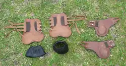 Knee boots, also known as knee caps and knee pads, cover the front of the knees to protect from bangs and from falls which land on the knees such as slipping on pavement. They are strapped above the knee, drape across the front of the knee, and are loosely strapped below the knee to allow for the knee to bend while still being held in position. They may be made of felt, neoprene, or leather.[1]: 218–221 [2]: 287