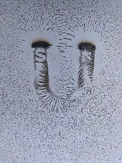 Magnetic field of a horseshoe magnet. The field is greatest where the lines are densest, around the poles (lower)