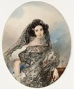 The rider is portrayed as young and beautiful, and the horse serves "as a pedestal for her beauty".[10] The rider is dressed in a fashionable, elegant costume designed for riding. She wears a long, snow-white skirt and a blue silk blouse with sleeves that are narrow at the forearms and wide above the elbows. The girl's delicate waist is bound with a corset. The dark headdress shades "the soft tenderness of the ruddy face, the elastic curls of blond hair and the bright blue eyes".[41] The girl's head is surrounded by a long, curved veil like by a halo.[42] Apparently a similar veil was used by Bryullov in a double watercolor portrait of K.A. and M.Y. Naryshkin (according to another version, N.G. and Z.A. Volkonsky) in 1827. It is believed that this gauze veil was made of the rare fabric Gaze de Sylphide.[43]