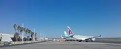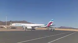 during the era ofAfter Namibian Independence in March 1990,[7] the French airline, UTA (Union de Transports Aériens) included operations from Paris–Charles de Gaulle to Windhoek via Johannesburg and Gaborone.[8] Hosea Kutako International Airport was the main hub for Air Namibia. Until recently, the absence of limited, direct international flights to Windhoek has forced passengers to fly via Johannesburg's OR Tambo International Airport, or Cape Town International Airport, resulting in additional transit visa costs, visa processing time taken by respective embassies and longer travel time.[9] There are around 46[10][11][12][13][14] direct flights weekly between Hosea Kutako International Airport and O. R. Tambo International Airport. Menzies Aviation, an international company registered in the UK,[15] was awarded the ground handling service operations at Hosea Kutako International Airport in November 2013.[16] However, they were evicted in August 2023 due to a long-standing legal battle with the Namibia Airports Company. Paragon commenced ground handling services in replacement shortly after.[17] Condor Airlines introduced flights between Frankfurt and Windhoek since November 2014.[18] Since 2016, Qatar Airways, KLM Royal Dutch Airlines and Ethiopian Airlines have started flying to Windhoek. Qatar Airways suspended operations to Windhoek in October, 2023.[19]Eurowings, the low-cost subsidiary of Lufthansa, commenced a bi-weekly service from Cologne/Bonn in July 2017. However, in a bid to streamline its long haul operation for the 2019-season, the airline has decided to end both the Cologne/Bonn and Munich routes to Windhoek.[20][21] In recent schedule updates however, Eurowings Discover introduced daily flights to the Namibian capital since July 2022, as well as daily doubles 3 times weekly including flights to and from Victoria Falls.[22] As of October 2017, around 315 flights depart and land at HKIA weekly.[23] In August 2017 Air Namibia was granted 5th freedom rights to operate cargo and traffic between Windhoek, Lagos, Nigeria and Accra, Ghana.[24] These destinations were cancelled by the airline in May, 2019.[25] Westair Aviation has commenced scheduled flights April 1, 2018 from Windhoek-Eros.[26] In March 2018, Ethiopian Airlines introduced Africa's first Boeing 787-9 Dreamliner to Namibia.[27][28] Due to flight performance and headwinds, Airlink in March 2019 has decided to re-direct its technical fuel-stop in Windhoek to Walvis Bay Airport, a move which would accommodate more passengers on the final leg to Saint Helena Airport.[29] FlyWestair, a subsidiary of privately owned Westair Aviation introduced scheduled passenger flights between Windhoek and Cape Town from early March 2022.[30]