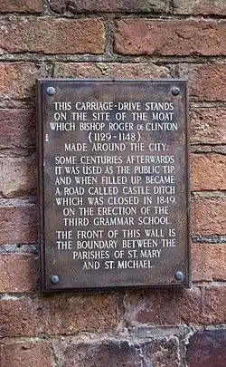 In 1129, Roger de Clinton was appointed Bishop of Lichfield. He built a new cathedral fortified the Cathedral Close and laid out a new town. Finally he constructed a defensive ditch and walls around the city.[2] There were four gates or 'barrs' allowing movement in and out of the city walls, which were closed at 8 or 9 at night and reopened at 7 in the morning.[3]
