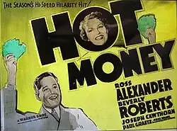 Hot Money is a 1936 American comedy film directed by William C. McGann and written by William Jacobs. The film stars Ross Alexander, Beverly Roberts, Joseph Cawthorn, Paul Graetz, Andrew Tombes and Cy Kendall. The film was released by Warner Bros. on July 18, 1936.[1] It was based on the play of the same name by Aben Kandel who also co-wrote the screenplay. The story was used twice before in such films as High Pressure (1932) and a French speaking version in the same year Le bluffeur.
