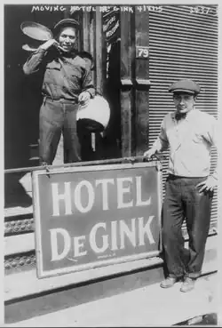 The United States experienced a recession starting in 1913.[6] Productions and real income declined during this period and were not offset until the start of World War I increased demand.[7] During this time, there were high periods of unemployment and homelessness.[8] The Hotel de Gink existed to provide relief in these circumstances.[9]