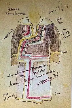 Princess Tesegesheva - the wife of Prince Chychkan Tesegeshev. Vasily Radlov met her in 1860. She was wearing a fox fur coat lined with pink silk fabric. The princess wore silver jewelry.[28]