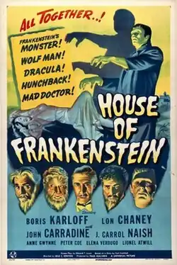 House of Frankenstein is a 1944 American horror film starring Boris Karloff, Lon Chaney Jr. and John Carradine. It was directed by Erle C. Kenton and produced by Universal Pictures. Based on Curt Siodmak's story "The Devil's Brood", the film is about Dr. Gustav Niemann, who escapes from prison and promises to create a new body for his assistant Daniel. Over the course of the film, they encounter Count Dracula, the Wolf Man (Larry Talbot), and Frankenstein's monster. The film is a sequel to Frankenstein Meets the Wolf Man (1943).[4]