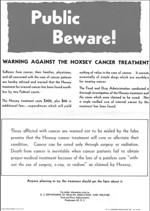 - ^ Cancer "Care" Described; U.S. Agent Tells of Visits as Hoxsey Clinic "Patient". Published in the New York Times on October 12, 1956; accessed September 5, 2008.