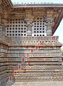 The temple outer walls is intricately carved. Its lowest layers consist of bands with friezes that consist of (from bottom to top) elephants, lions, scrolls with nature and miniature dancers, horses, scrolls, scenes from Hindu texts,[10] mythical beasts (makara) and swans.[35][36][37] According to Shadakshari Settar, the artwork shows details as "no two lions are alike in the entire span that covers more than a furlong (200 metres)", the artists "captured the Ramayana and the Mahabharata, and the main episodes of the Bhagavata". The temple's outer wall is a pictorial narration of Hindu epics, and its middle portion has large panels where "the entire pantheon of Hindu divinities are presented, it is a manual of Hindu iconography", states Settar.[36] According to Foekema and other art historians, the quality and quantity of the epics-related "friezes are amazing", but the panel series do not complete the story in a stretch, rather after a stretch, another text is intermingled in for a while.[38][39] The outer walls of the Hoysaleswara temple shrines feature 340 large reliefs.[40]