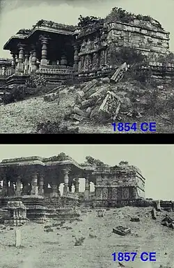 With the defeat of Tipu Sultan in 1799, Mysore came under the influence of the colonial British rule and scholarship. The Hoysaleswara temple ruins were among the earliest surveyed,[26] then earliest photographed in the 1850s,[15] and the subject of several rounds of good will repairs and restoration that lacked thorough documentation. Ruin panels from other temples were reused here to cover the Nandi mandapa, parts of friezes used to repair the plinth. Thus, the Hoysaleswara temple as it is survives in the contemporary era is a composite of the original Hindu temple architecture and design that was open, to which stone screens with outer walls and doors were added by the 14th-century, whose crowning towers (shikhara) have been lost, and whose ruins were repaired and restored many times in the 19th and 20th-century.[27]