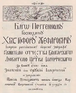 "To the well reputable gentleman Hristofor Zhefarovich, Illyro-Rascian universal icon-painter, zealot of Bulgarian fatherland, lover of Illyrian Empire"