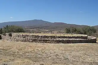 It is located at the northernmost edge of the sunken patio-altar complex. It consists of two concentric stone circles, the outer circle measuring about 20 meters (66 feet) in diameter, with no other visible structural remains. The circle is not complete, its south side, facing the altar is flat against the altar structure.[2]