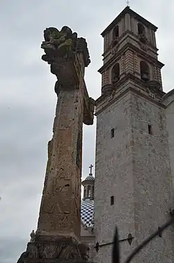 The town itself is oriented east-west, centered on a main plaza.[2][4] On the west side of the plaza is the San Jeronimo parish church, a rustic structure which was extensively renovated in the late 20th century. Its atrium contains a large atrium cross which was sculpted by indigenous hands in the colonial period, possibly those who created the atrium cross at the nearby church in Capacho, with its flower motifs and depiction of arms.[4] On the north side of the plaza is a church where they venerate a Christ figure called the Señor del Amparo, made from joined corn stalks.[4]